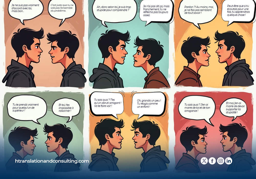 La violence verbale, dans laquelle s’inscrivent l’insulte et l’injure, est un phénomène complexe qui ne se réduit pas à une simple agression langagière. Les travaux de recherche menés dans ce domaine montrent qu’elle s’articule autour d’une montée en tension interactionnelle, marquée par une série d’étapes et de déclencheurs discursifs (Moïse, Auger, Fracchiolla et Schultz-Romain 2008). L’analyse de cette montée en tension met en évidence plusieurs types de violence verbale, allant de l’attaque frontale à des formes plus insidieuses d’agression langagière.